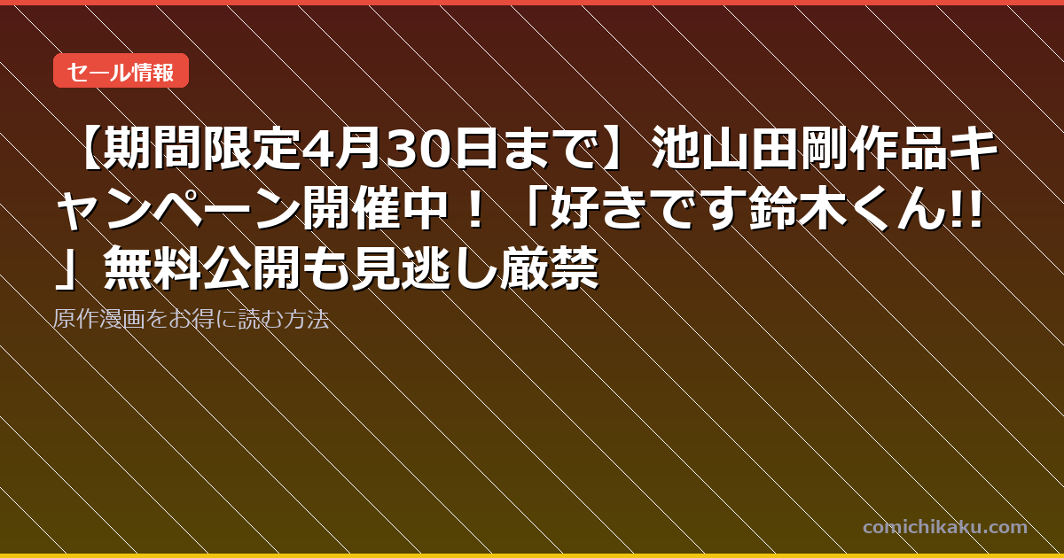 池山田剛作品の特別キャンペーンは4月30日までの期間限定開催です。「好きです鈴木くん!!」の無料公開をはじめ、ファンには見逃せない内容が盛りだくさん。各電子書籍サービスの初回クーポンと組み合わせれば、さらにお得に作品を楽しむことができます。このチャンスを逃さず、今すぐキャンペーンをチェックしてみてください!